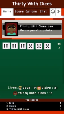 Note: If you are able to hold all dices with the same penalty points, you are allowed to continue with all the six dices for a new round. The total amount of penalty points are stored, and each new dice will be added tot the penalty total.