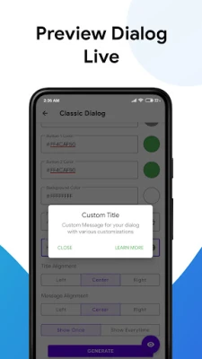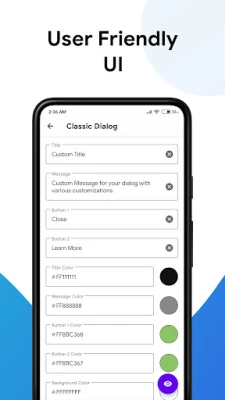 Features: ✓ Rich Customisability for your Pop-up designs. ✓ Inbuilt Color Picker to make customizing easier. ✓ Live preview for your Dialogs. ✓ Supports code obfuscation. ✓ Inbuilt Dalvik code generator to help with usage. ✓ Supports both light and dark themes. ✓ Optimized usage for phones and emulator.